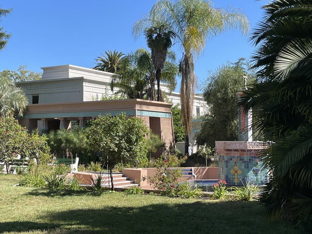 The architecture of the museum is inspired by an Egyptian temple. In the gardens around the museum there are other interesting buildings, plants, including pampas grass, trees, and statues with an Egyptian theme.
